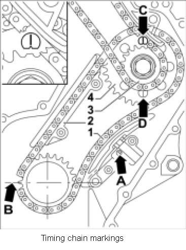 ^ Check all components, such as timing chains, sprockets, locking pins and chamfers for wear or damage. Replace faulty components.