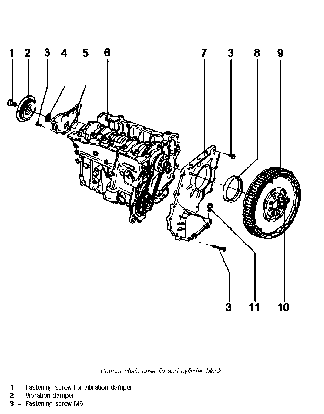 5. Tighten all fastening screws M6 (6 M6 x 56 screws and 1 M6 x 20 screw) Tightening torque 6 ft. lbs. --> Fastening screws and the M8 x 28 fastening screws -2- to the tightening torque Tightening torque 17 ft. lbs.. Screw in chain tensioner with a new sealing ring -1-. Tightening torque 30 ft. lbs..