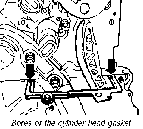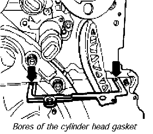 1. Prepare cylinder head gasket for installation of the chain case lid. To do this, apply silicon sealant 000.043.300.32 to the corners of the cylinder head gasket and cylinder head. Fill the bores of the cylinder head gasket with sealant -arrows-.
