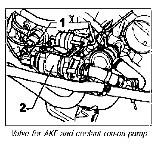 11. Fit valve for active carbon filter and coolant run-on pump to sheetmetal bracket and connect cable plug for active carbon filter valve -1- and cable plug for coolant run-on pump -2-.