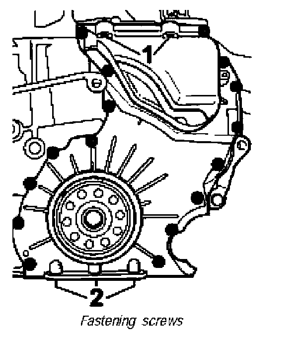 3. Position and tighten all fastening screws , to do this, tighten 2 M8 x 28 -1-, 14 M6 x 16, 2 M6 x 57 and 3 M6 x 18 (oil pan) -2- to tightening torque. Tightening torque 7.5 ft. lbs. Tightening torque 9 ft. lbs. Tightening torque 19 ft. lbs..