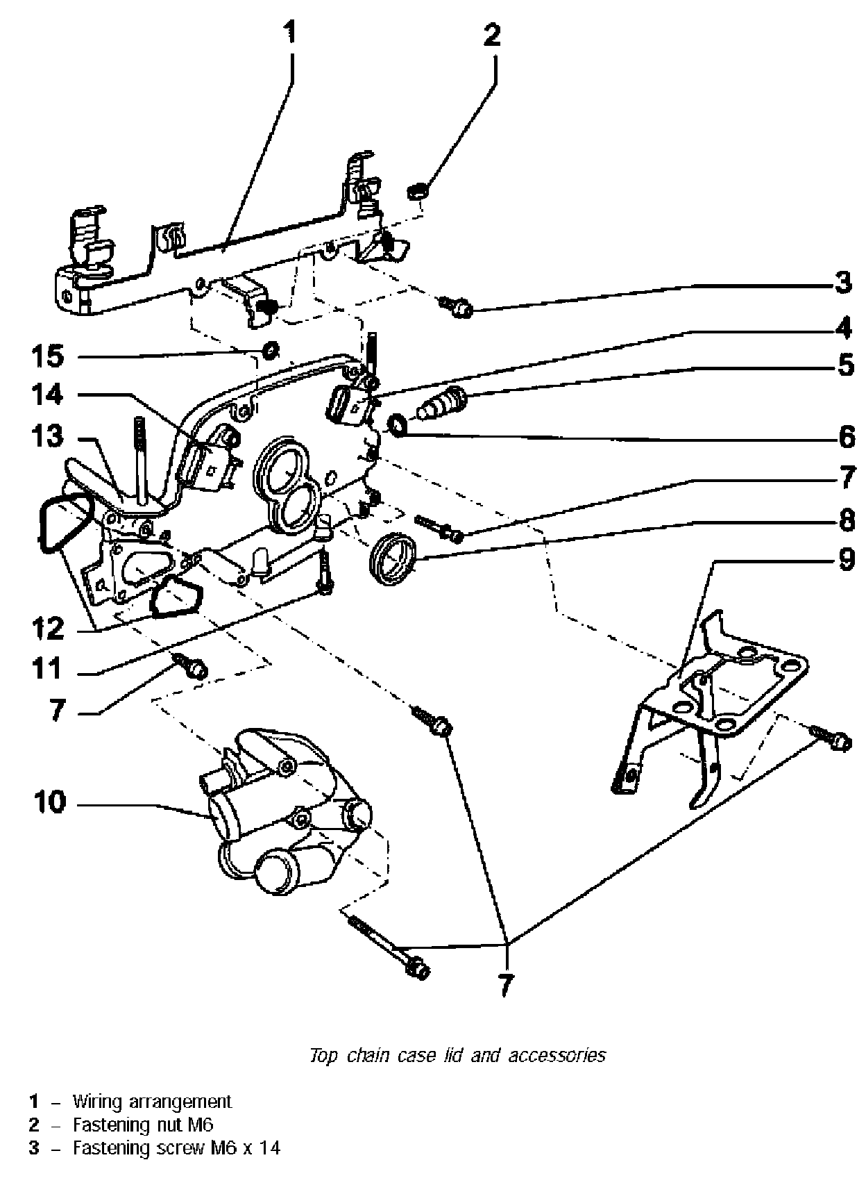 12. Remove top chain case lid. To do so, undo 6 M6 x 70, 1 M6 x 20 and 2 M8 x 30 fastening screws -2- and loosen chain case lid by tapping it carefully with a plastic hammer.