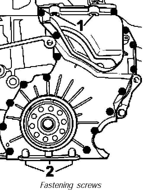 1. Loosen all fastening screws, to do so, unscrew 2 M8 x 30 -1-, 14 M6 x 16, 2 M6 x 57 and 3 M6 x 18 screws (oil pan) -2-.
