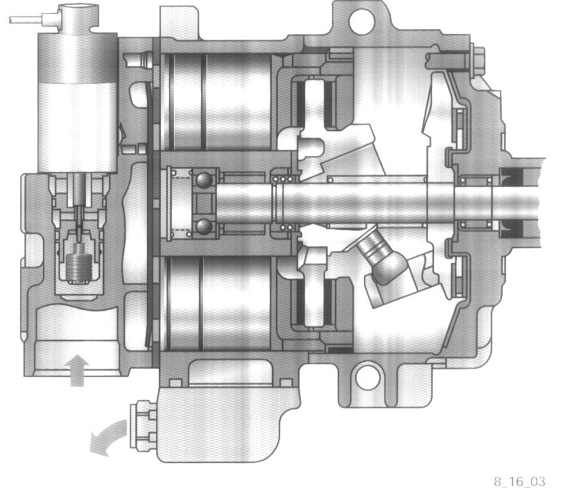 Through an electronic control valve integrated into the compressor the low side pressure in the compressor controls the swash plate. The control valve is triggered by a PWM signal from the Climate Control module. The control valve is operated depending on the signal of the evaporator temperature sensor.