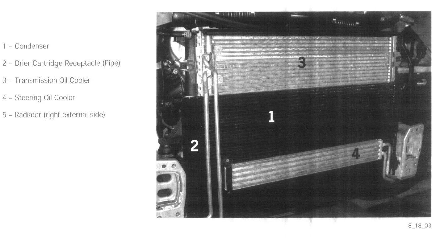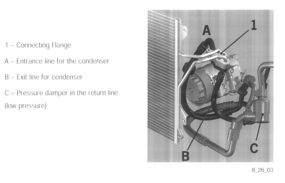 The replaceable drier cartridge is in a special line. This receptacle line is integrated into the right side of the condenser (see section "Condenser").