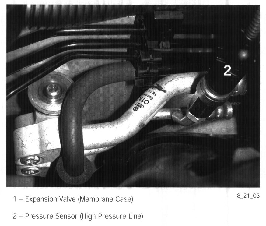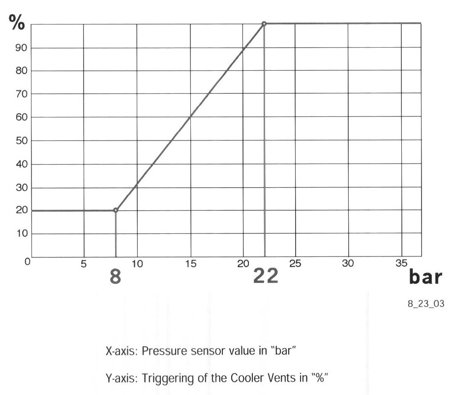 The vertical direction of the condenser lines cools the entrance temperature from 100 degrees Cto about 60 degrees C. In order to make this jump in temperature possible at any time, the smaller engine fan is triggered (see the diagram in section DME, Cooling Fans). The following triggering of the cooling fans is possible, depending on the pressure of the AC system.