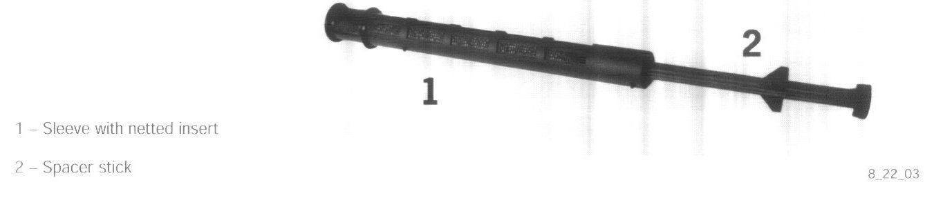 After the covers have been removed, the drying cartridge can be pulled out with the spacer stick. The cartridge unit is approximately 380 mm long. It is composed of a spacer and a sleeve with a netted insert that contains a moisture binding material. Until saturated, the drying cartridge can chemically bind 612 grams of system.