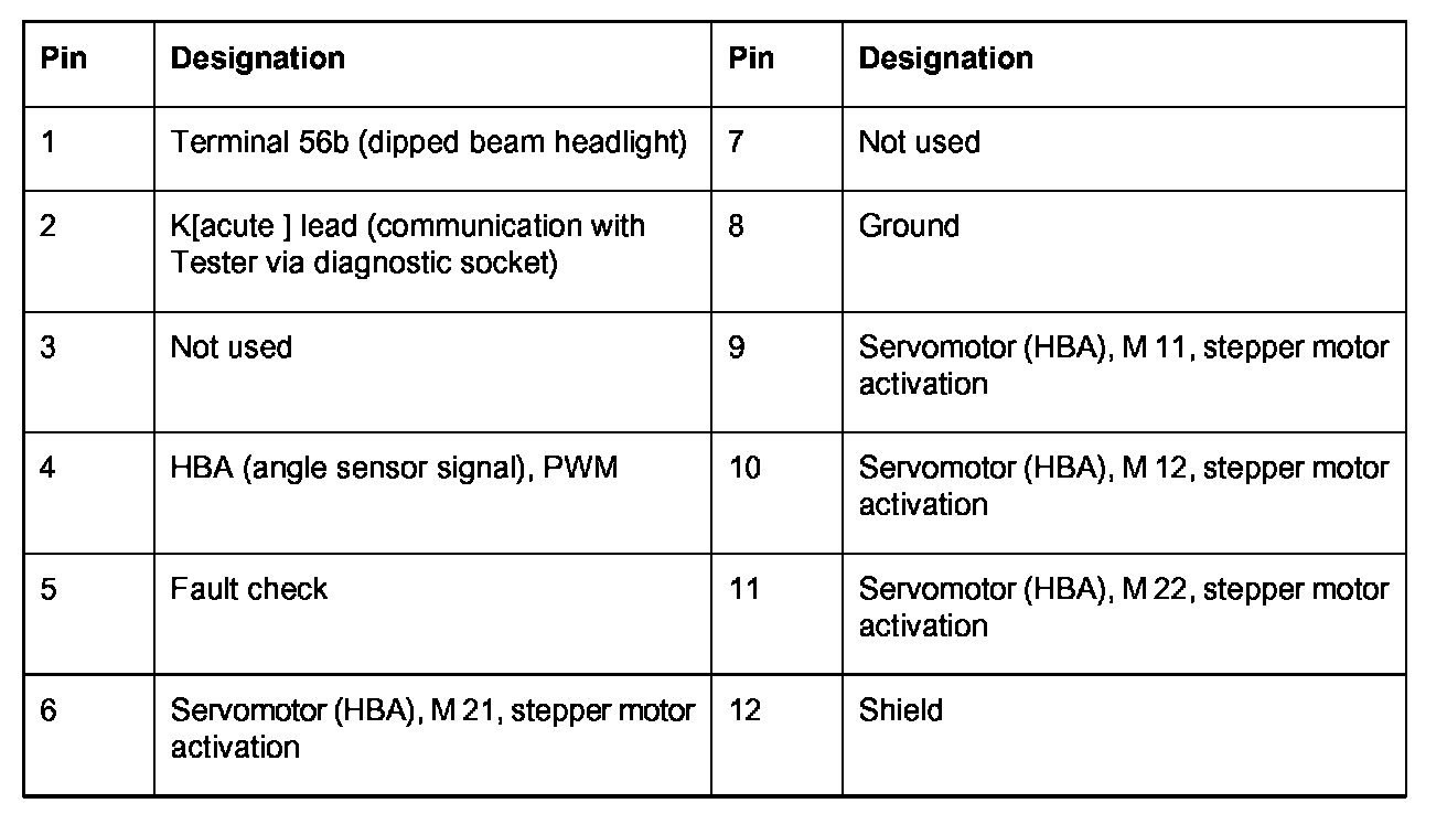Connector assignment for headlight beam adjustment, HBA (Xenon)