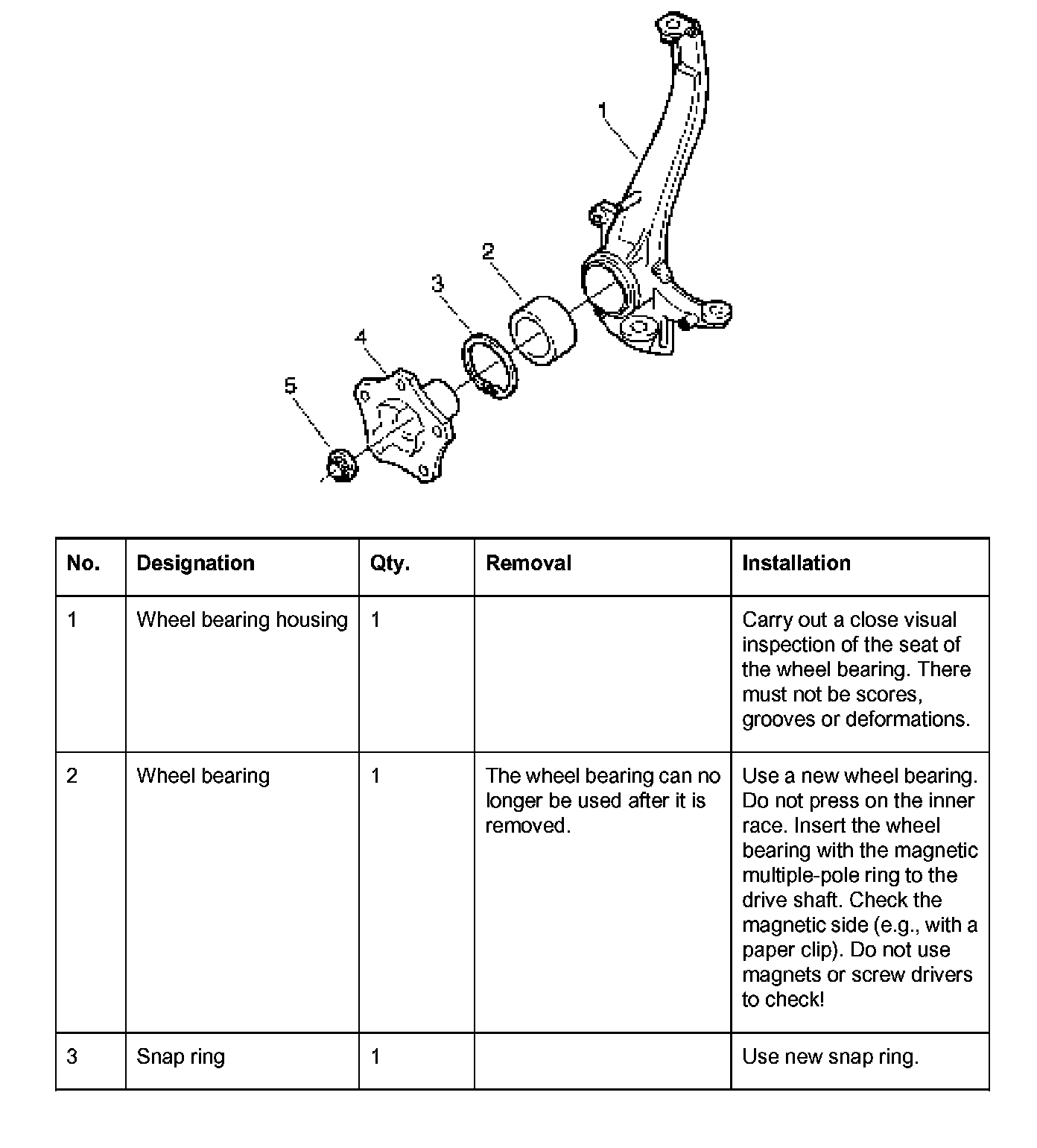^ Insert the wheel bearing with the magnetic multiple-pole ring to the drive shaft. Check the magnetic side (e.g., with a paper clip). Do not use magnets or screw drivers to check!