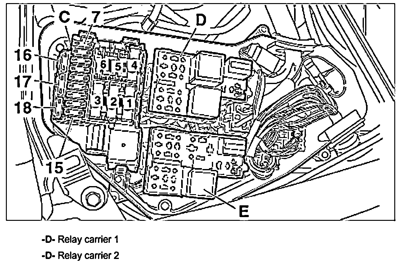 In its maximum equipment version, the Cayenne has 4 relay carriers. 2 relay carriers are located in the E-box in the radiator tank and 1 or 2 relay carriers (according to the I-No.) are located on the driver's side below the dashboard.