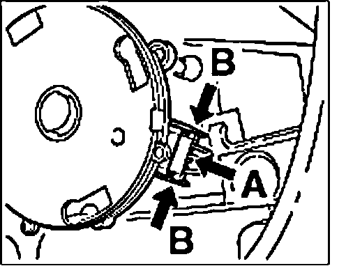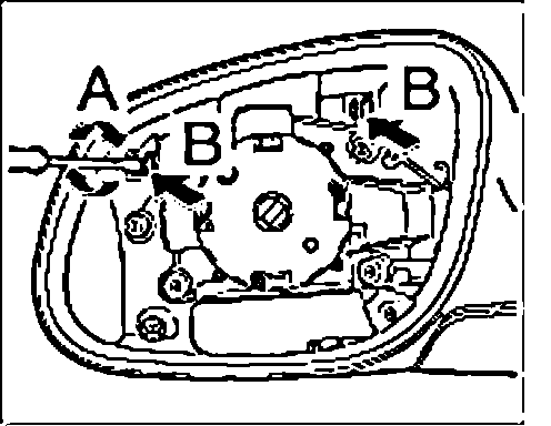 4. Unlock connector on mirror adjusting motor with 2 screwdrivers "arrow A" and remove "arrow B".