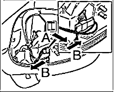 9. Link up connector to the mirror adjusting motor "arrow A" until the connector lock "B" engages firmly.