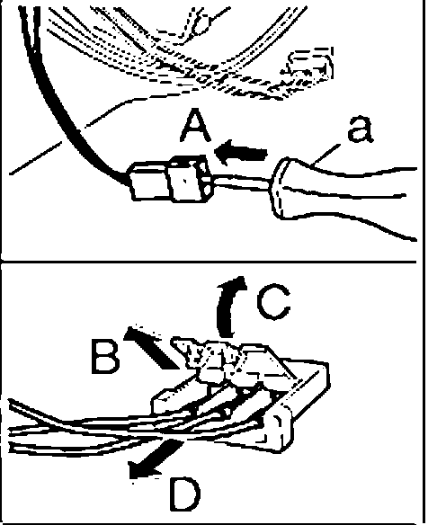 7. Press out the plug contacts, using the press-out tool "a" Press-out and unlocking tools for flat and round plug connections of every size 155 refer to 'Tools', from the connector housing "arrow A"