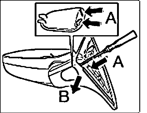 3. Press the tab on the upper mirror cover apart with a screwdriver "arrow A" and remove upper mirror cover towards the rear "arrows B".