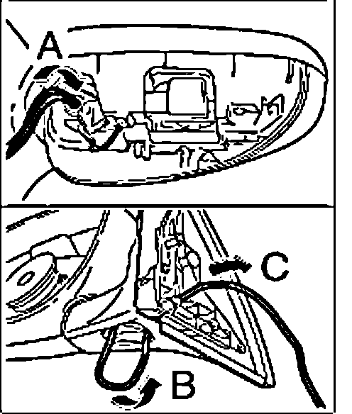 12. First pull the wiring downwards "arrow B" and take it out on the mirror base "arrow C".
