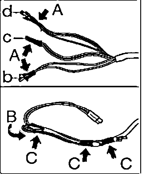 1. Connect the wires for the mirror heating "b", flap "c" and positioning motor "d" together using fabric or insulating tape "A".