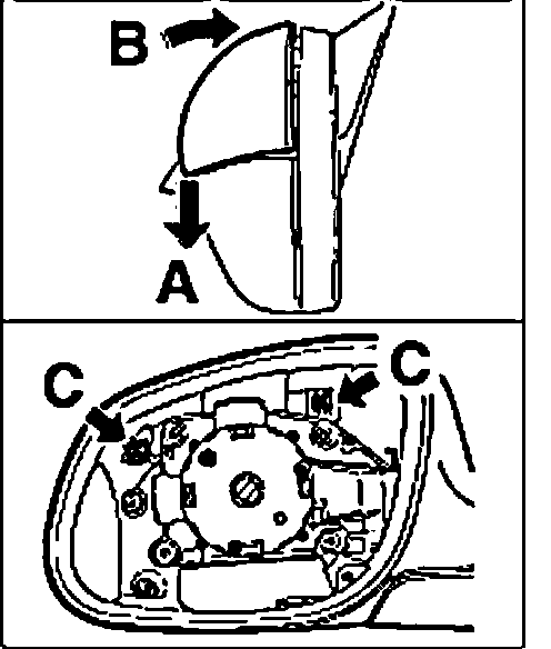 12. Secure upper mirror housing in lower mirror housing "A" and fold onto mirror cover "B" until the tab "C" locks by clicking into place.