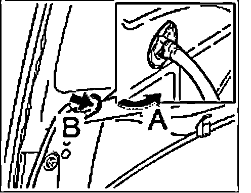 10. Push through the water line, together with the electrical lead, to the windscreen washer nozzles and pull out at the openings "arrow B".