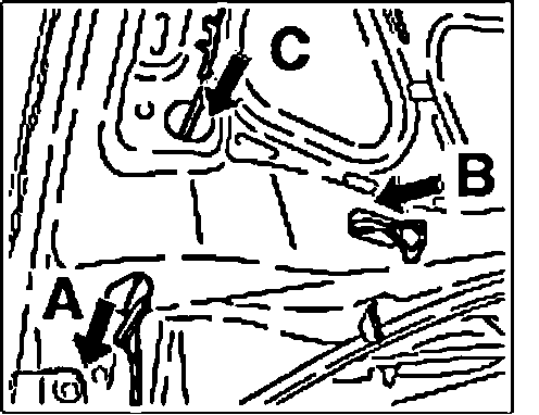 11. Pull the wiring harness to the engine compartment light out of the bonnet reinforcement "arrow C".