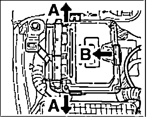 13. Remove DME control unit in a forward direction "arrow B" and place it on the radiator tank.