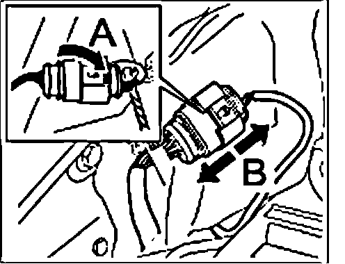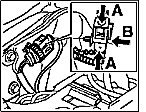 17. Connect the plug to the engine compartment light "arrow A" until the lock is felt to engage "arrows B".