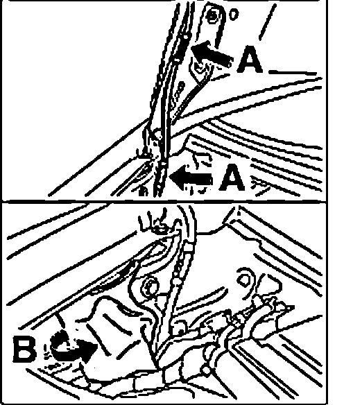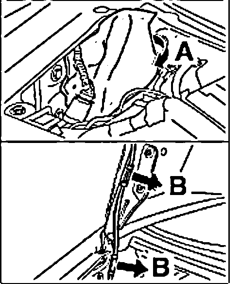 17. Unclip wiring harness on bonnet hinge "arrows B".