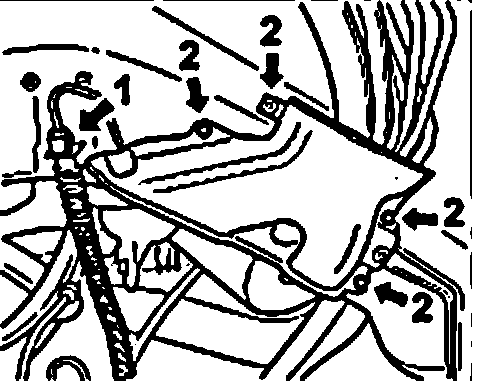 37. Disconnect the electric plug -1- on the rear right side member and then clip on the electric cable from the sheetmetal holder -2-.