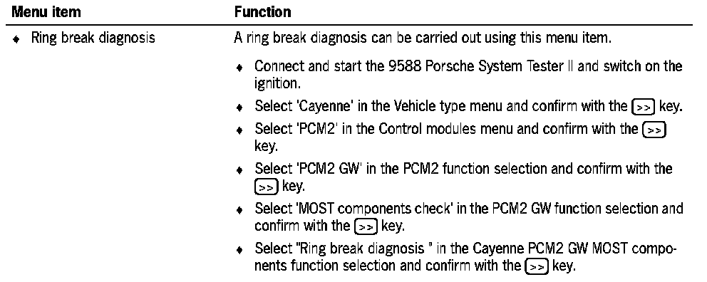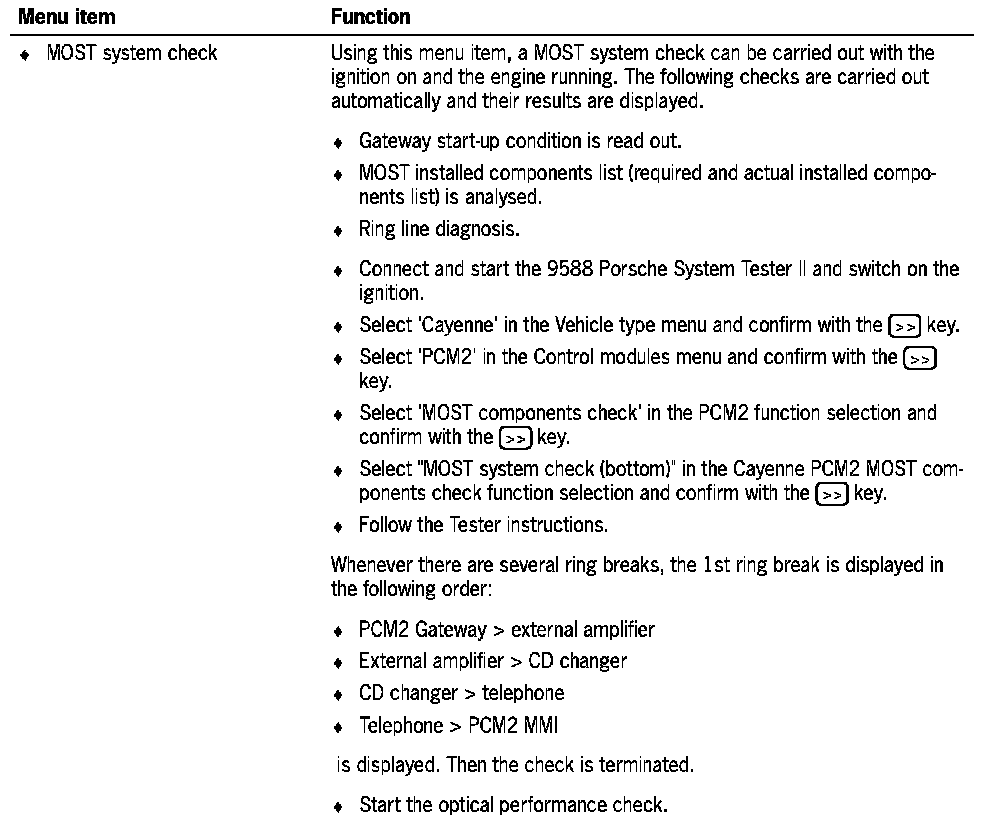 The MOST component check can be reached via the menu PCM2 or CDR23 function selection. This comprises a summary of the following check processes: