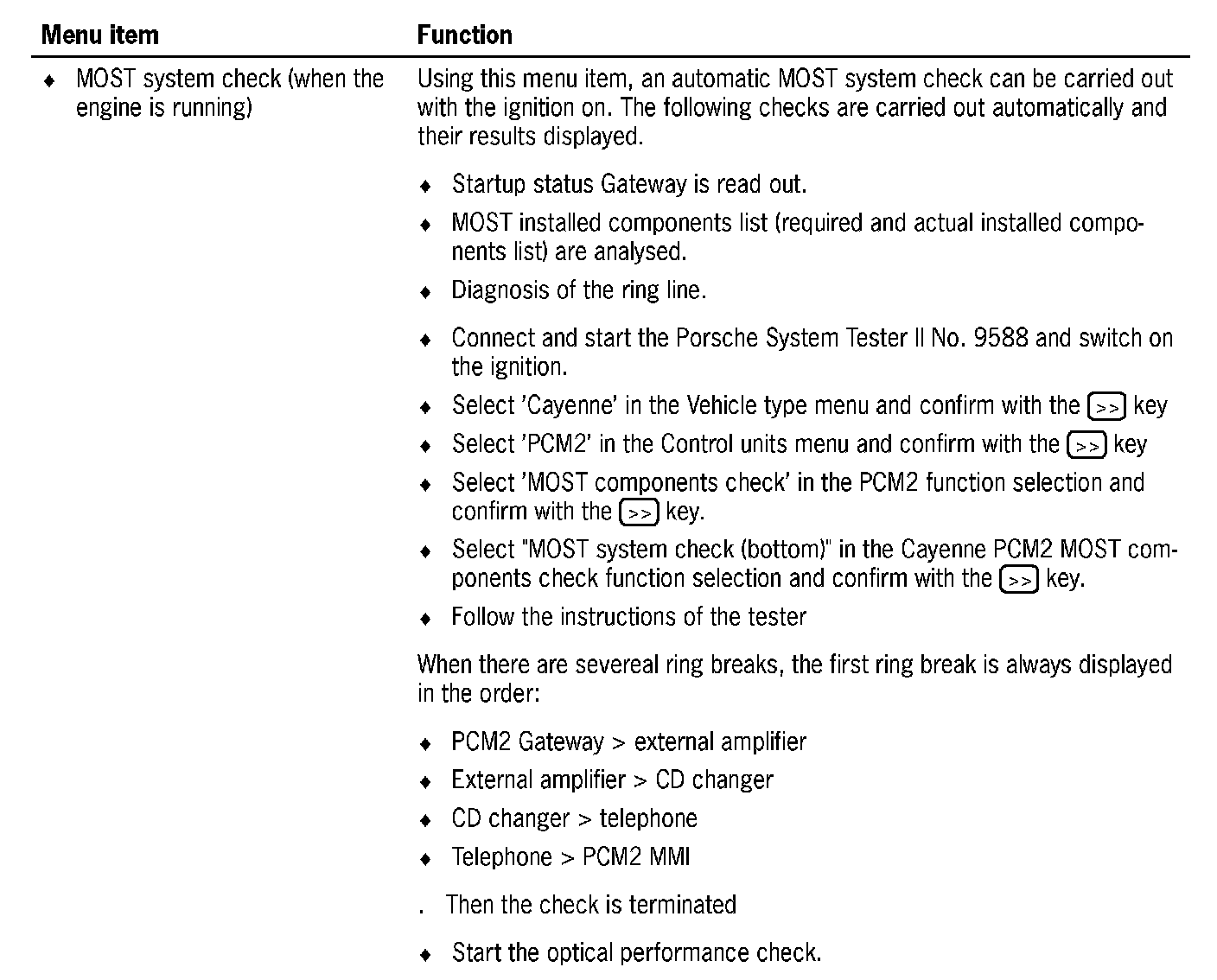 The MOST component check can be reached via the menu PCM2 function selection. This comprises a summary of the following check processes: