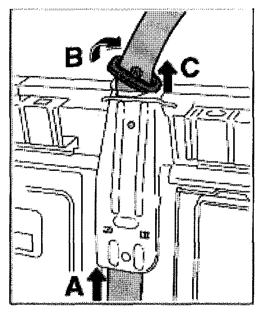 2. Twist belt lock -arrow B- and remove from the belt guide -arrow C-.