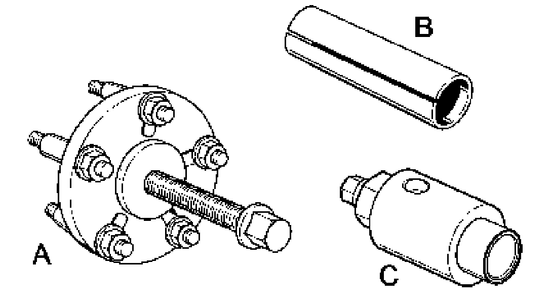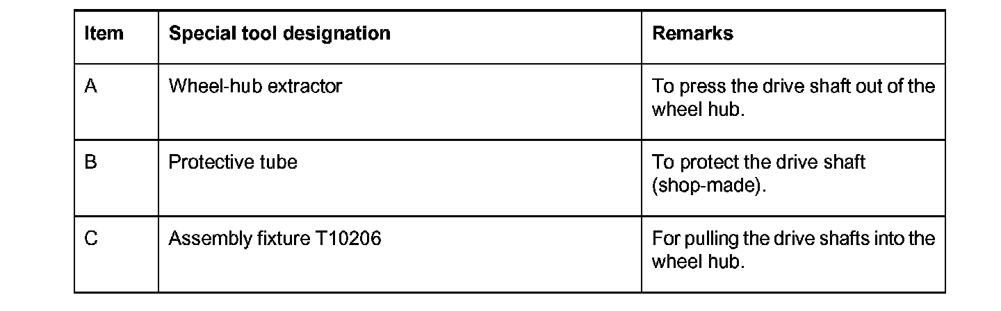 1. Insert the drive shaft into the wheel hub. If it is not possible to push shaft in all the way, use assembly fixture T10206 to pull drive shaft in. Screw on the axle nuts in order to prevent the shaft from slipping out.