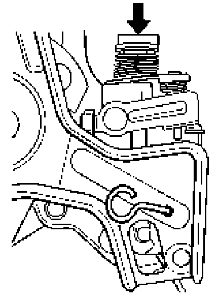 7. Attach the foot-operated parking brake to the actuating mechanism using an -auxiliary pin-. To do this, press the adjustment fixture -(arrow)and relieve it with a maximum 3.5-mm drill (or similar).
