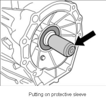 1. Push special tool protective sleeve T10186-arrow- onto output shaft.