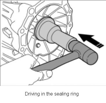 3. Remove special tool protective sleeve T10186 and drive in sealing ring flush using special tool pressure piece T10180-arrow- arrow.