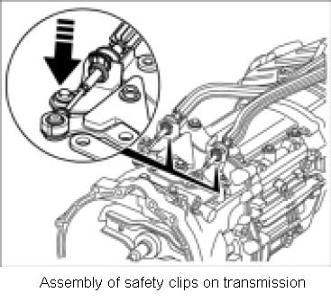 12. Remove safety clips on bottom section of gearshift bracket -1st arrow-, then remove operating cables -2nd arrow-.