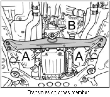 6. Unscrew four screws -A- on transmission cross member.
