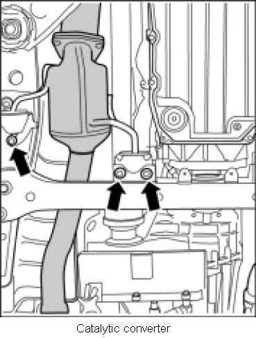 4. Loosen fastening screws securing exhaust system support -centre arrows- to transmission cross member.