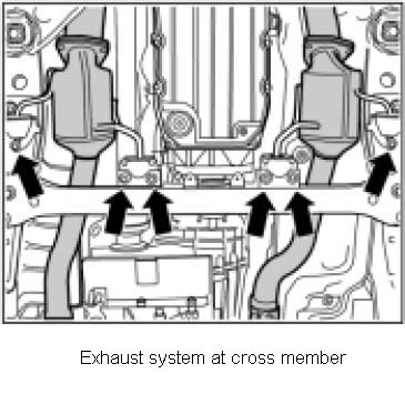 4. Fix exhaust system to transmission cross member -centre arrow-and body -outer arrow-. Observe torques