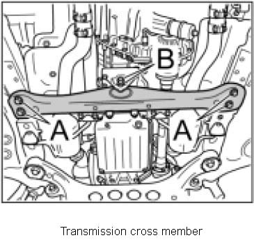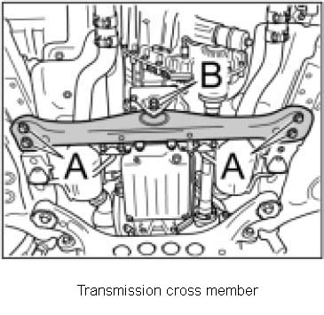 2. Screw in new transmission cross member screws -B- on transfer box holder. initial tightening: 37 ftlb. final tightening: 90 degree of angle