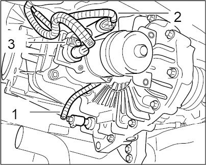 2. Gradually run in transfer gear. Press vent line into holder -arrow- and attach to transfer gear.