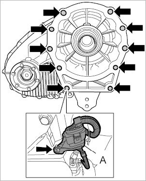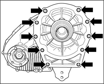 9. Unscrew fastening screws -arrows- securing transfer gear to main transmission.