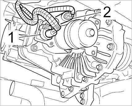 10. Connect cable plug -1, 2- to the transfer gear and secure the cable holder.