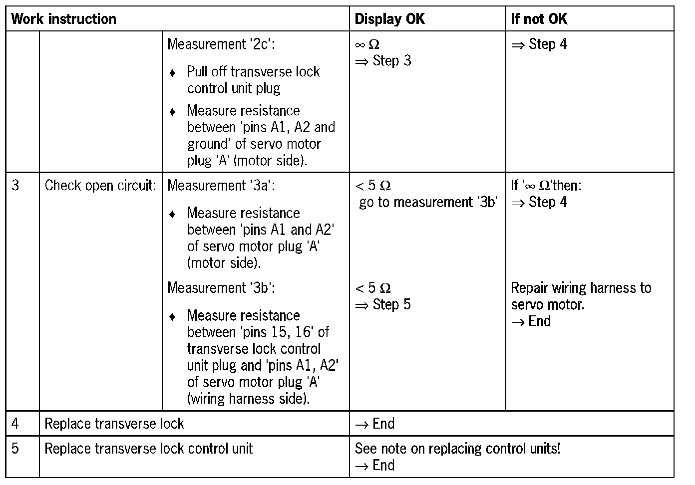 Visual inspection: In the next troubleshooting section, please check first that the affected 'pins' of the transverse lock control unit plug connection and the 'pins' of the plug connections on the servo motor are neither damaged nor corroded. Remove any soiling or corrosion/oxidation. Replace damaged parts/wires.