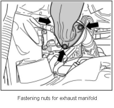 4. Fasten primary catalytic converter to the exhaust manifold. To do this, fasten three fastening nuts. Tightening torque: 17 ft-lb.