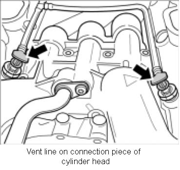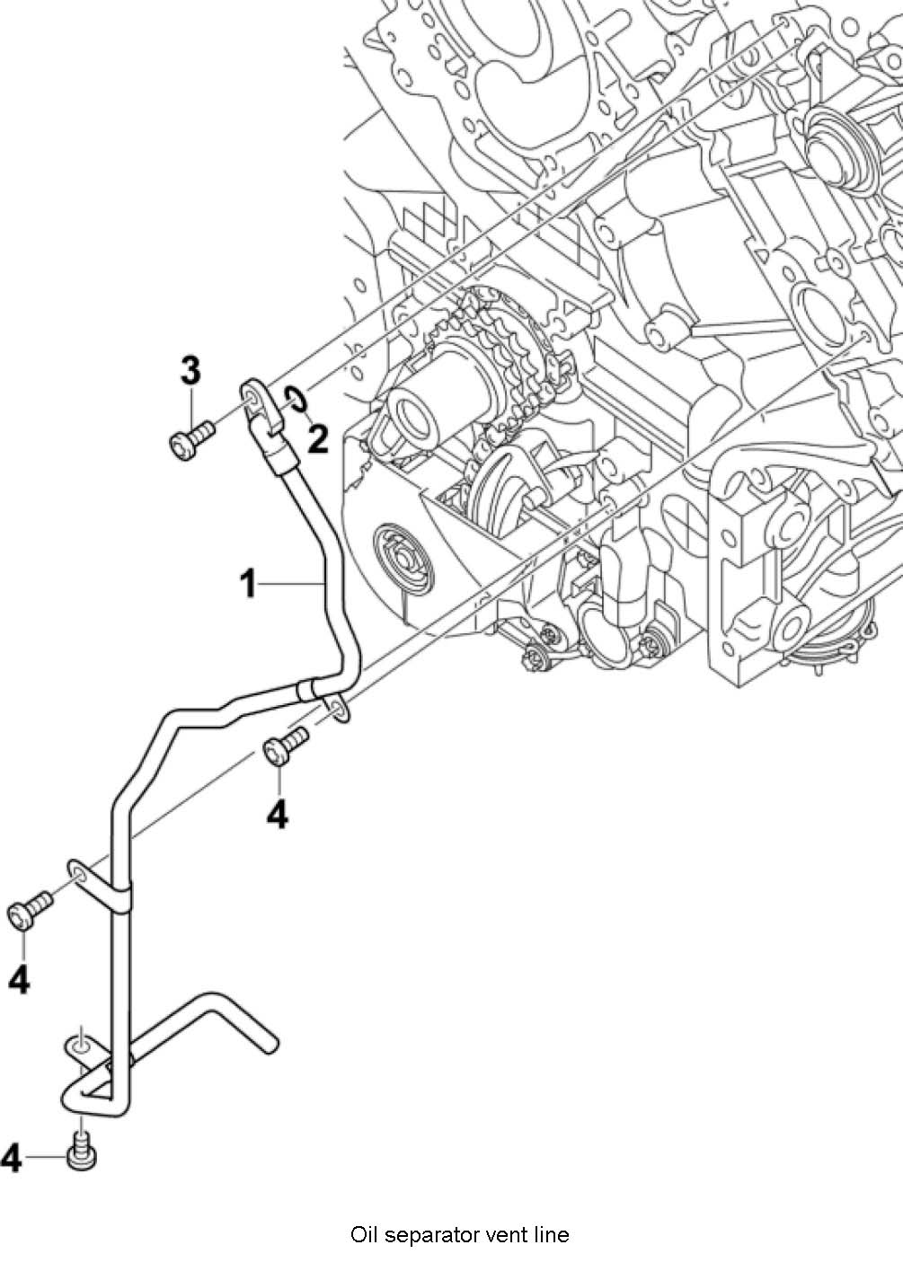 7. Mount oil separator vent line onto cylinder head with new sealing ring -2-. To do this, position and tighten the fastening screws -3 and upper 4-. Tightening torque: 7.5 ft-lb.