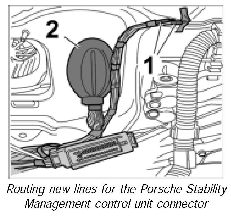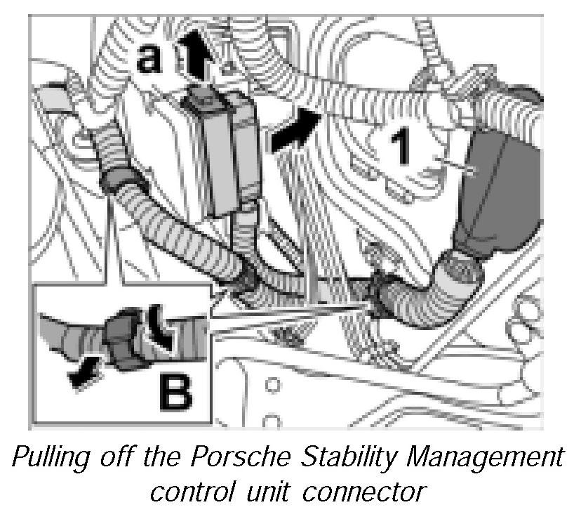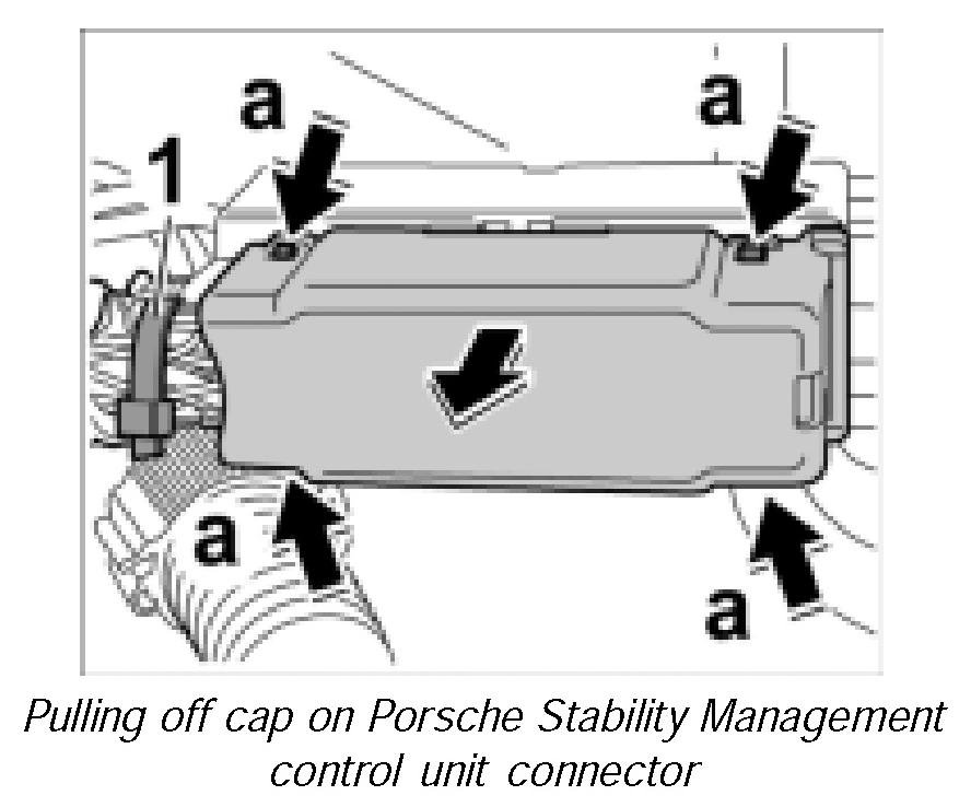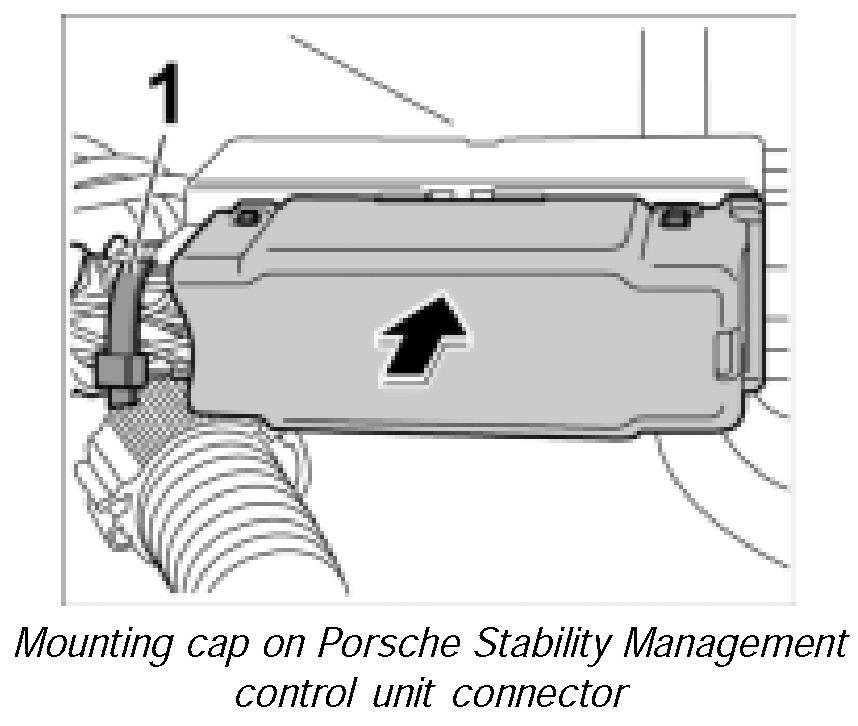 25. Mount cap on Porsche Stability Management control unit connector until this is felt to engage.