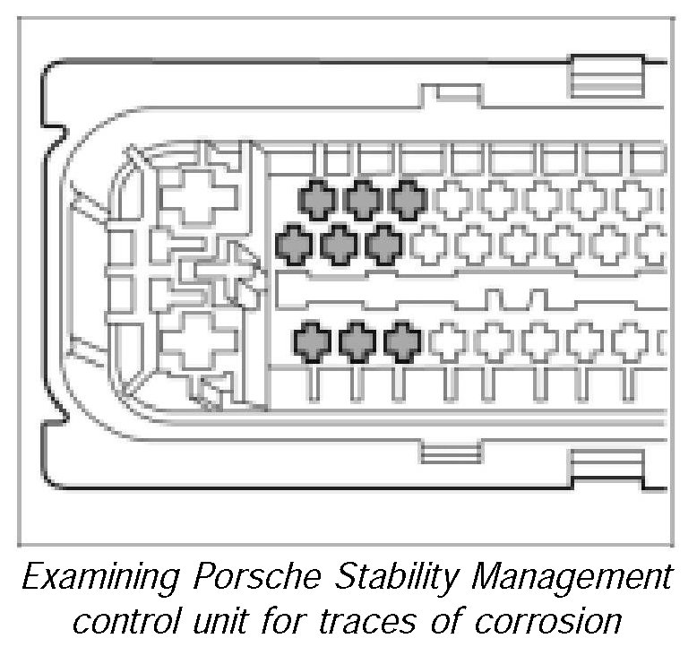 For all 3 repair variations, the contacts on the Porsche Stability Management control unit must be examined carefully for traces of corrosion. If existing traces of corrosion cannot be removed, the hydraulic unit must be replaced.