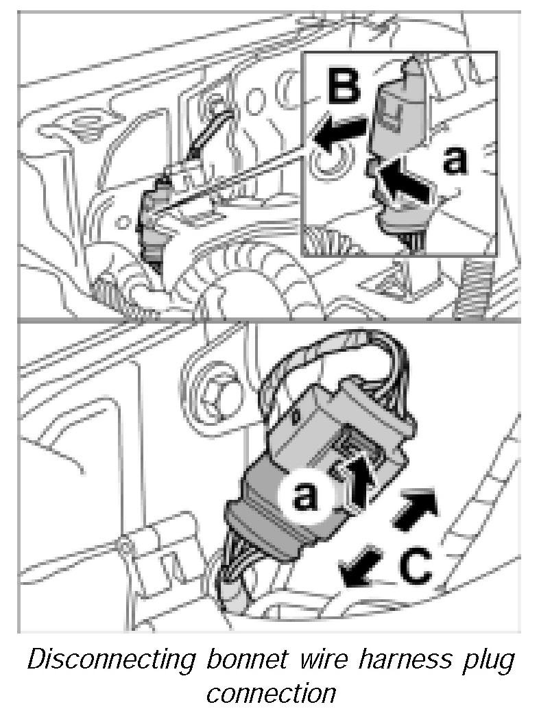 4. Release the bonnet wire harness plug connection -arrow a- and disconnect -arrow C-.