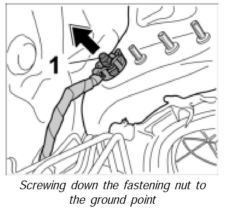30. Mount ground strap together with the twist lock on the stud and screw down with the fastening nut -1-. Tightening torque 6.5 ftlb.