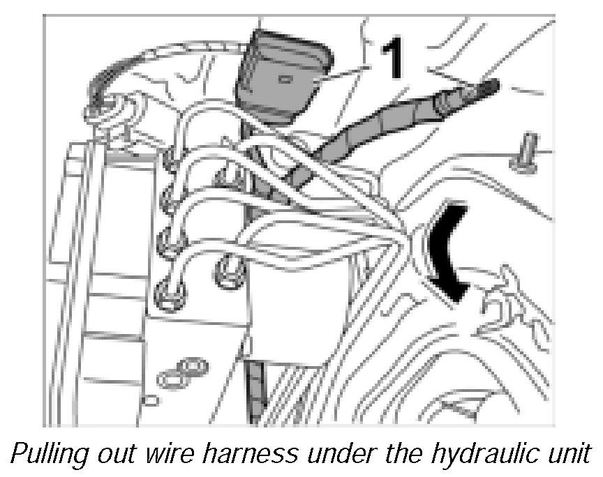 6. Pull out wire harness -1- under the hydraulic unit. Remove armouring and disconnect ground strap from bonnet wire harness.